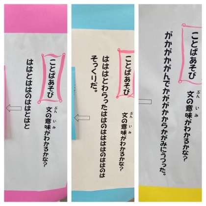 図書館指導員のIさんがいろいろ展示を工夫してくださっています。言葉遊びのコーナーを作ってくださいました。