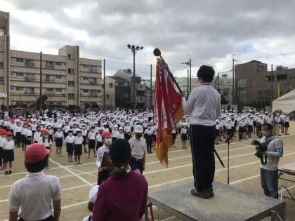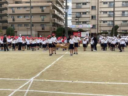 校歌をもった6年生の代表を先頭に、各学年が入場。優勝旗、準優勝盾の返還、選手宣誓を行いました。
