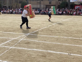 4つの箱を運ぶ競技。落としてもまた荷物を積んで一生懸命運びました。見ていてほほえましい競技に思わず拍手です!