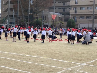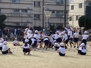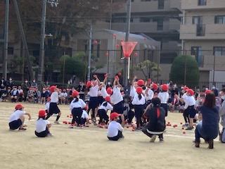 「ヒゲダンス」曲に合わせてかわいいダンス。音楽が変わると一生懸命玉を掴んで投げ入れます。練習の時はいつも赤組が勝っていたのに、本番は白が2勝しました!?