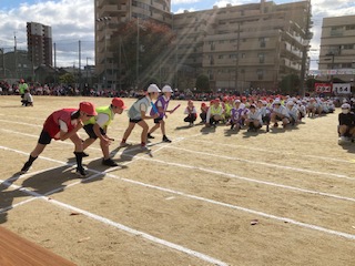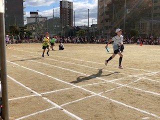 後半トップは5年生のリレー。勝負の決め手はバトンパス。自主学習で調べてきて、どの方法が一番自分たちに合うか研究して臨みました!
