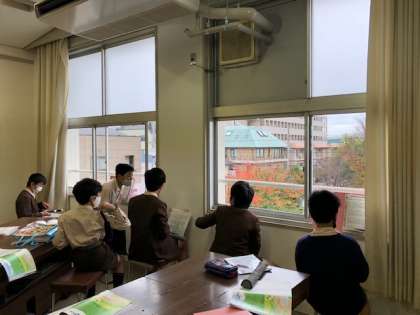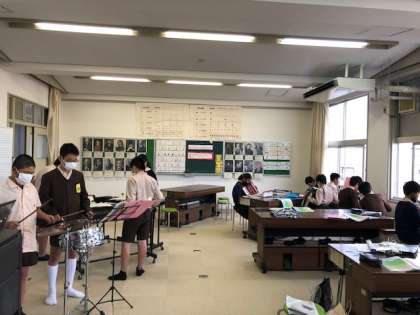 リコーダーは、新型コロナを防止の観点から離れた場所で窓側を向いて吹いています。
