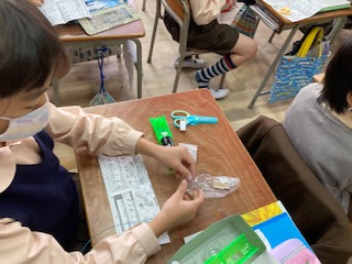 乾電池と豆電球、導線を繋げて懐中電灯を作りました。