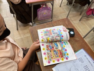あいさつの練習をした後、アルファベットの読み方、単語を何度も発音して覚えました。