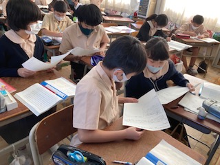「和の文化を受けつぐ」の本論1と2をそれぞれのクラスで学習しました。本論2は、形式段落をばらばらにして、順序を考え、なぜそうなるのか理由を明らかにして並べかえる学習をしました。