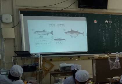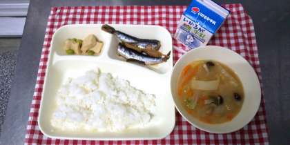今日は、いわしのしょうが煮、みそ汁、高野豆腐の煮もの、ごはん、牛乳でした。いわしは鮮度が落ちやすく小さいので鰯(魚へんに弱い)と漢字で書きますが、筋肉をつくるたんぱく質や骨を丈夫にするカルシウム、脳の働きを良くするDHAなどを含む栄養たっぷりの魚です。一年生の中にも丸ごとよくかんで食べていた子がいましたよ。