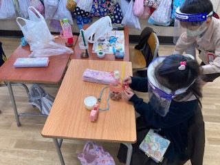 見つけたどんぐりやまつぼっくりなどを使ってマラカスややじろべえ、こま、モビールなどを作っています。