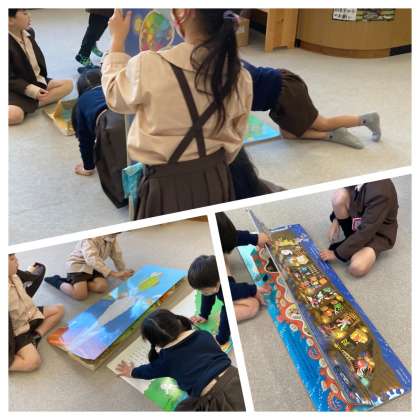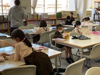 本校の図書室は、一段高くなった畳のスペースがあり、読書は、椅子に座らなくて、床で読んでも良いことにしています。そうすることで、大型絵本も友達と仲良く読み合うこともできています。