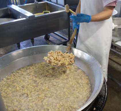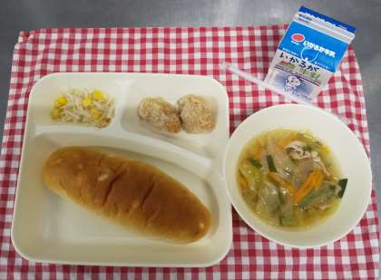 今日の給食は、鶏肉のからあげ、中華みそスープ、もやしとコーンの甘酢あえ、おさつパン、牛乳でした。給食室で下味と衣をつけて丁寧に揚げた唐揚げは子どもたちに大人気です。