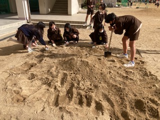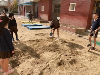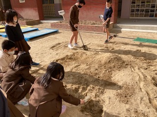 小さい方の砂場の土が、かちかちになっていました。6年生が、柔らかくしてくれていると、3年生がやってきて、いっしょに掘り返してくれました。