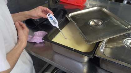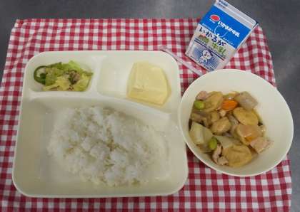 今日は、卵どうふ、鶏肉と一口がんもの煮もの、野菜のそぼろいため、ごはん、牛乳でした。給食では卵豆腐も手作りです。削り節でとった出汁で旨味たっぷりに仕上げています。