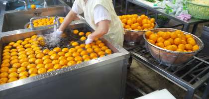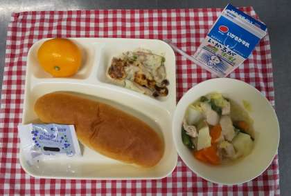 今日は、鶏肉とじゃがいものスープ煮、きのこのドリア、みかん、コッペパン、ブルーベリージャム、牛乳でした。給食室のドリアはお米を湯に浸すところからの手作りです。たくさんのみかんもきれいに洗ってくれましたよ。