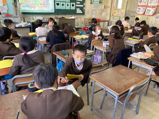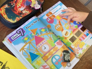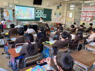 身の回りにあるものの形の名前を言ったり、聞き取ったことを指さしたりしながら、色や形の単語を練習しました。