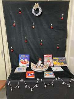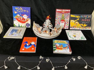 クリスマスのディスプレイと本が並びました!立ち止まって飾りや本を見てくれるとうれしいです!