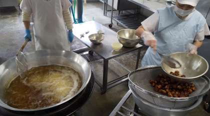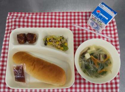 今日は、あげシューマイ、とうふのスープ、ツナとチンゲンサイのいためもの、コッペパン、いちごジャム、牛乳でした。たくさんのシューマイを給食室で揚げてくれました。