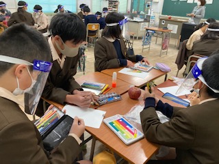 まず初めにりんごをよく見て、特徴を掴みました。色鉛筆で描いていきます。