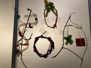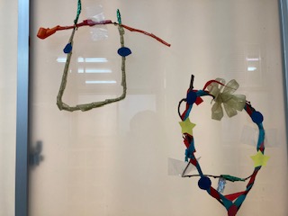 学校のキーウィのツルを使ってリースを作り、それに飾り付けをしました。枝で、来年の干支の模様もかたどっていて、廊下を通ると楽しい気分になります!