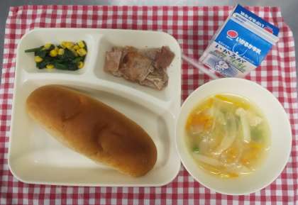 今日は、豚肉のガーリック焼き、スープ、ほうれんそうのソテー、黒糖パン、牛乳でした。冬に旬(一番おいしくて栄養豊富な時)を迎えるほうれんそうは、夏と比べるとビタミンCが3倍も高くなりますよ。