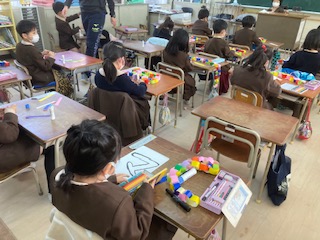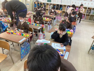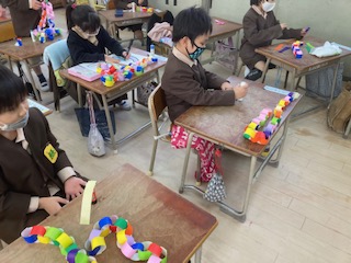 お楽しみ会・12月の誕生日会の飾りを作っています。誕生日カードを書いている子もいます。