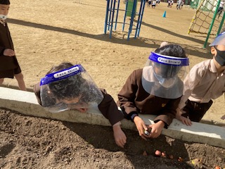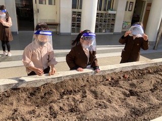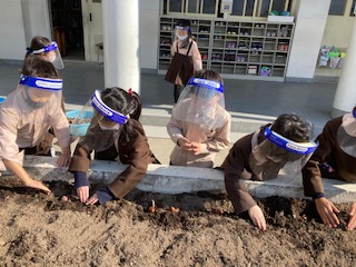 教室前の花壇にチューリップの球根を植えました。去年の球根からできたもので、たくさんありました。4月に新一年生が入学した時、花いっぱいになっているといいですね。