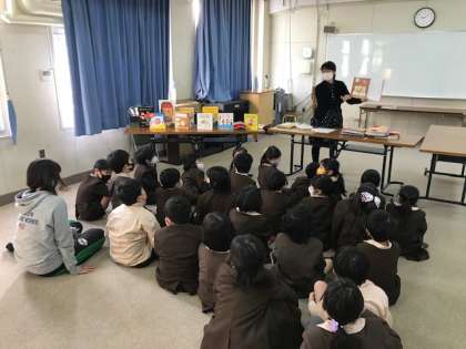 先日の2年に続いて今日は、1年でブックトークを行いました。仕掛け絵本や季節にまつわる絵本の読み聞かせをしてもらい、楽しい本もたくさん紹介していただきました。どの子も楽しそうに聞き入っていました。