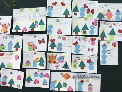 英語で形の勉強をしました。三角形や四角形の模様のカードを英語で買う想定で、店の人と2人組でやりとりをしました。買った形の模様を使ってクリスマスカードを作りました。