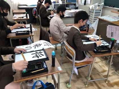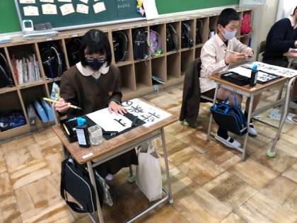 毛筆で書き初めを行いました。長い半紙に「将来の夢」と書きました。