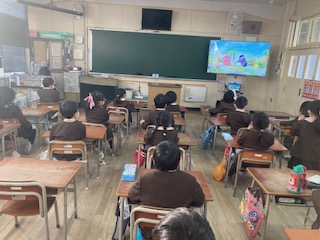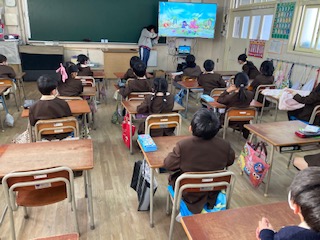 1年生の教室にも大型テレビが入りました。プロジェクターで見ていた映像よりもずっとクリアで、子ども達もよく集中できています。