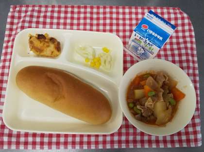 今日は、豚肉と野菜のケチャップ煮、カリフラワーのピクルス、桃のクラフティ、黒糖パン、牛乳でした。給食ではデザートも手作りを心がけています。クラフティはフランスの伝統菓子です。タルト生地の代わりにコーンフレークを使って焼きあげました。子どもたちにとても好評でしたよ。