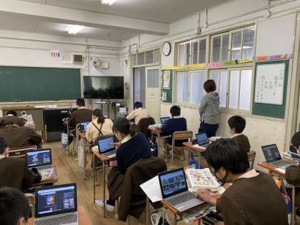 メモリアルボックスに描きたいデザインを一人一台端末で調べ、下絵を紙に描いていきました。