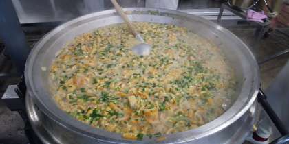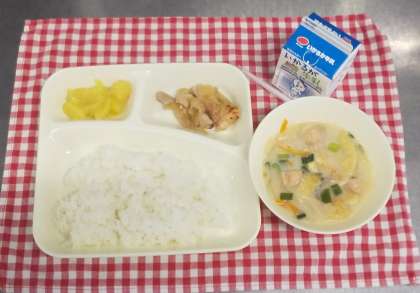 今日は、酒かすを入れた具だくさんのかす汁とおせち料理の栗きんとんに鶏肉の甘辛焼きを組み合わせた米飯献立でした。酒かすは体が温まるので寒い冬に最適です。給食では子どもたちが食べやすいように酒かすを少なめにして赤みそ白みそうすくちしょうゆで調味しています。栗きんとんは大釜で焦げつかないように潰しながら混ぜてとても滑らかに仕上がり好評でした。