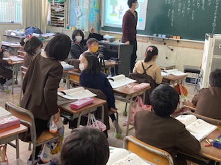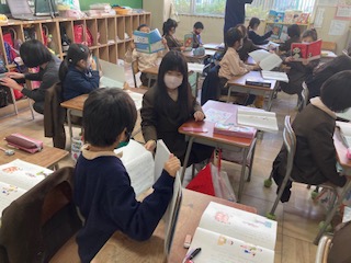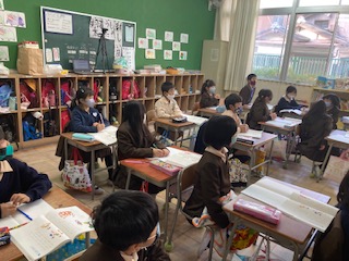 教科書の絵を見て、誰が何をしているか、どんな様子や気持ちか想像も入れて文に表しました。ペアでノートを交換して友達の表現の良さを見つけました。