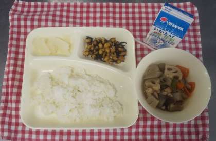 今日は、筑前煮、ひじき豆、だいこんのゆず風味、ごはん、牛乳でした。筑前煮は福岡県の郷土料理で「がめ煮」とも呼ばれ、正月や祝い事の時によく食べられます。旬(1番おいしくて栄養の豊富な時期)のれんこんやごぼうを使いました。