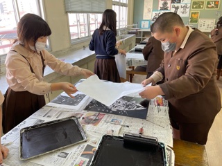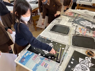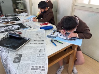 自分の顔を描いて版画を作ったいます。彫刻刀は初めてですが、怪我をしないように気をつけて慎重に彫り、出来上がってきました。彫っている線の向きなどで微妙に表情の違いが出ています。