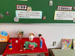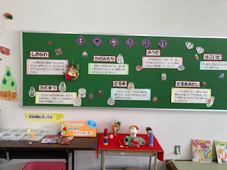 正月や冬の遊びなどを展示しています。関連する年中行事や遊びの本なども並べています。図書主任のM先生と図書支援員さんのアイディアです。
