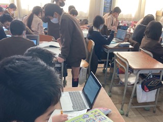 SDGsの17の目標から、自分が一番気になる項目を選び、インターネットで調べています。一人一台のノートパソコンは、とても使いやすくどんどん活用しています。