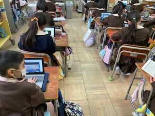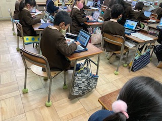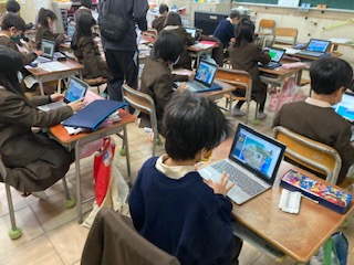 ノートパソコンを使ってキーボード練習をしました。画面上に次々と出てくる言葉を打つ練習です。