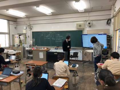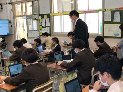 N先生が6年でプログラミング学習を行いました。プログルというプログラミングソフトを使って、公倍数を求める指示の出し方について一人一台パソコンで取り組みました。