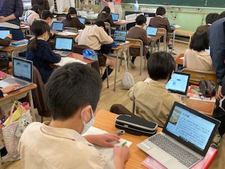 地域の特産品について調べています。一人一台のパソコンや図書などで調べています。分かったことをリーフレットにまとめています。