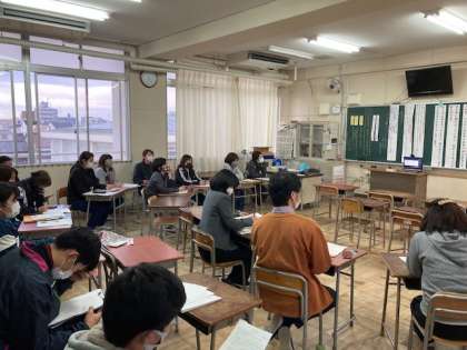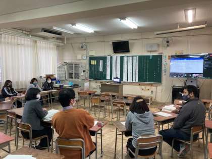 放課後、2年生の授業の研究討議会を行いました。授業は、リモートで教育委員会指導部の学力向上担当の先生方に見ていただいていたので、討議の後、Y先生からご指導をいただきました。