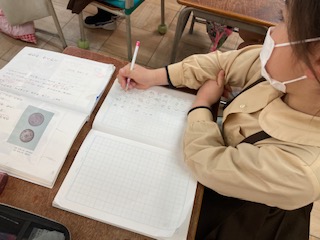 50円玉のあなのやくわりと、筆者の書き方の工夫について学習しました。教科書に書いてあるあな以外について自分で調べたことをまとめて「あなのやくわりブック」を作ります。そのために、書き方の工夫についてもしっかり学んでいきます。