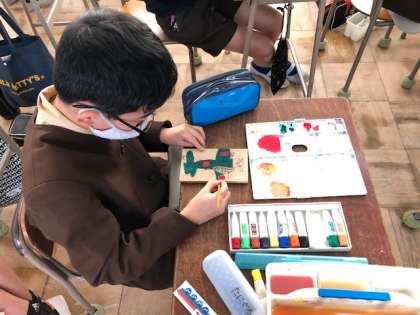 好きなデザインをカーボン紙で板に写し取り、彫刻刀で輪郭を彫ってから、絵の具で色をつけていきました。
