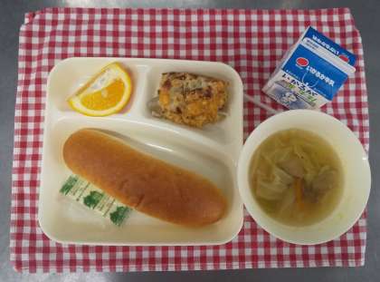 今日は、押麦のグラタン、スープ、いよかん、コッペパン、マーガリン、牛乳でした。押麦は小麦と同じイネ科の穀物で食物せんいが多く腸の動きを助ける働きがあります。白米と一緒に炊いたり、スープに入れたりするとプチプチとした食感が楽しめますよ。