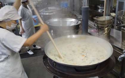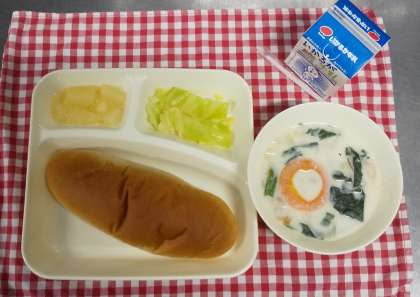 今日は、ほうれんそうのクリームシチュー、キャベツのサラダ、洋なし(カット缶詰)、黒糖パン、牛乳でした。給食のシチューはルウも小麦粉からの手作りです。可愛らしい形のラッキー人参も用意してくれましたよ。