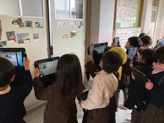 タブレットパソコンを持って校内を周り、写真の撮り方を