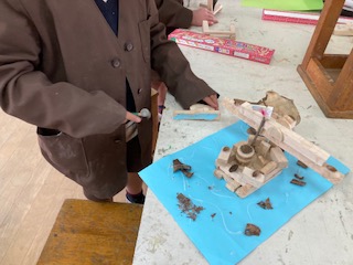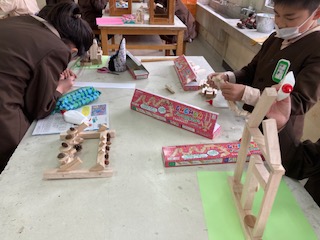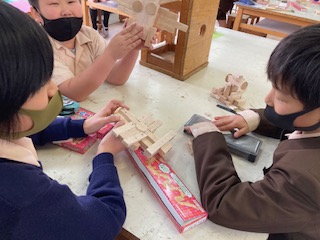 木片を鋸で切ったり、鍵で打ちつけたりして思い思いの作品を作っています。小枝やどんぐりなども工夫して作品に生かしています。
