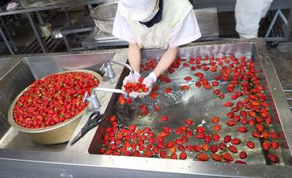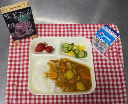 今日は、ポークカレーライス、きゅうりとコーンのサラダ、いちご、牛乳でした。調理員さんが真っ赤なたくさんのいちごを丁寧に洗ってくれました。ポークカレーライスにはかわいらしい形のラッキー人参も用意してくれました。見た目にもとてもカラフルな給食に子どもたちから「やったあ!」の声が出ていました。
