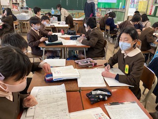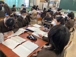 アンケート結果をまとめています。パソコンでするか紙でまとめるか、グループで選択して進めています。
