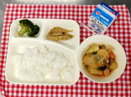 今日は、きびなごてんぷら、一口がんもとじゃがいもの煮もの、ブロッコリーのごまあえ、ごはん、牛乳でした。きびなごを使った郷土料理がある鹿児島県南部では、帯のことを「キビ」、小魚を「なご」ということからこのように呼ばれるようになりました。給食室でカリッと揚げてくれて、みんな丸ごと食べていましたよ。