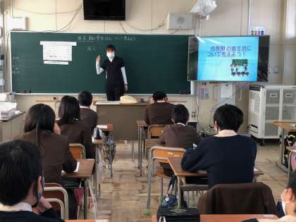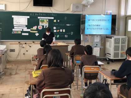 6年で、栄養教諭のF先生による栄養指導を行いました。1日に300g以上の野菜を食べることが望ましいということや主食主菜副菜をバランスよく食べることの大切さについて学びました。